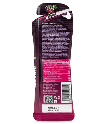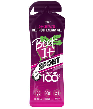 • New concentrated beetroot Energy Gel Top Up 100 is great tasting and delivers a “top-up” dose of 100mg of nitrate, 150mg sodium and 30g of fast absorbing carbohydrate (2:1 glucose-to-fructose ratio) – not just another energy gel!